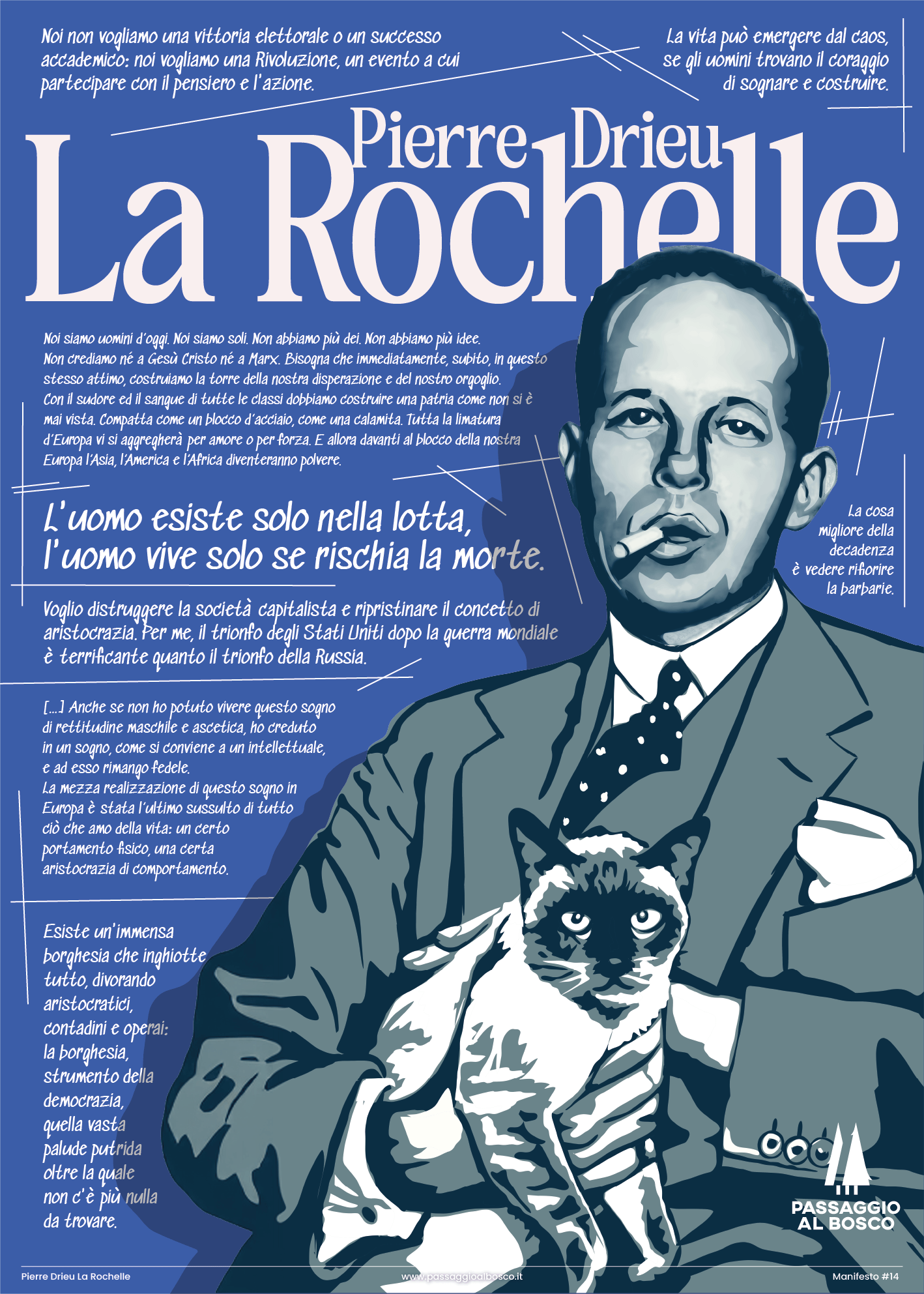 Quattordicesimo poster di Passaggio al Bosco che rende omaggio a Pierre Drieu La Rochelle: intellettuale antiliberale e antiborghese, voce radicale della crisi europea, alla ricerca di una sintesi tra disciplina, socialismo e idea imperiale del continente